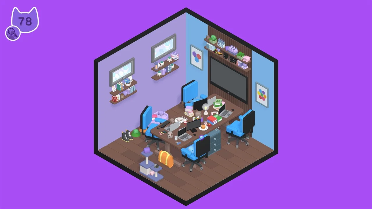 Вращайте комнату, чтобы лучше видеть препятствия, наводите курсор и кликайте на каждую обнаруженную кошку, постепенно обнуляя счетчик в левом верхнем углу экрана. Secret Paws - Cozy Offices — это спокойная, непринужденная и терапевтическая игра с успокаивающим саундтреком, которая станет идеальным развлечением в любое время!