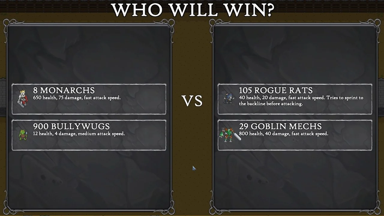 Behold Battle is a simple auto battler, where you see heroes and monsters fight to the death in randomly generated battles.