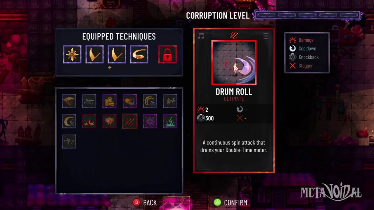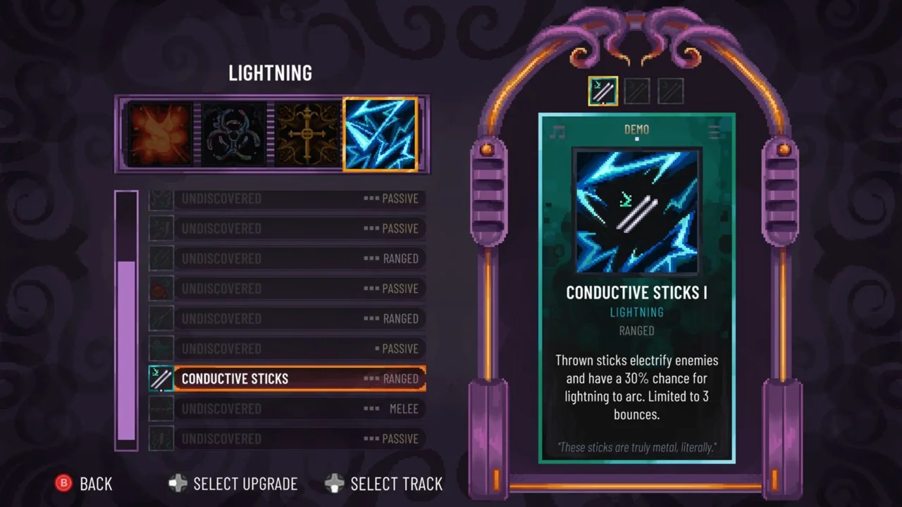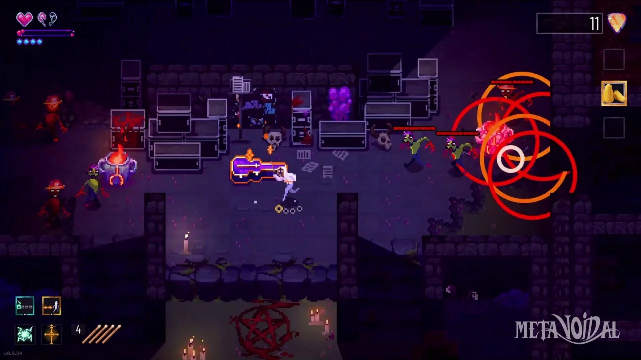 Use the metal band's own music against them by collecting the lost music records found in every level. Choose one of a dark trinity of tracks to add to your playlist that will imbue you & your drumsticks with different corrupted powers.