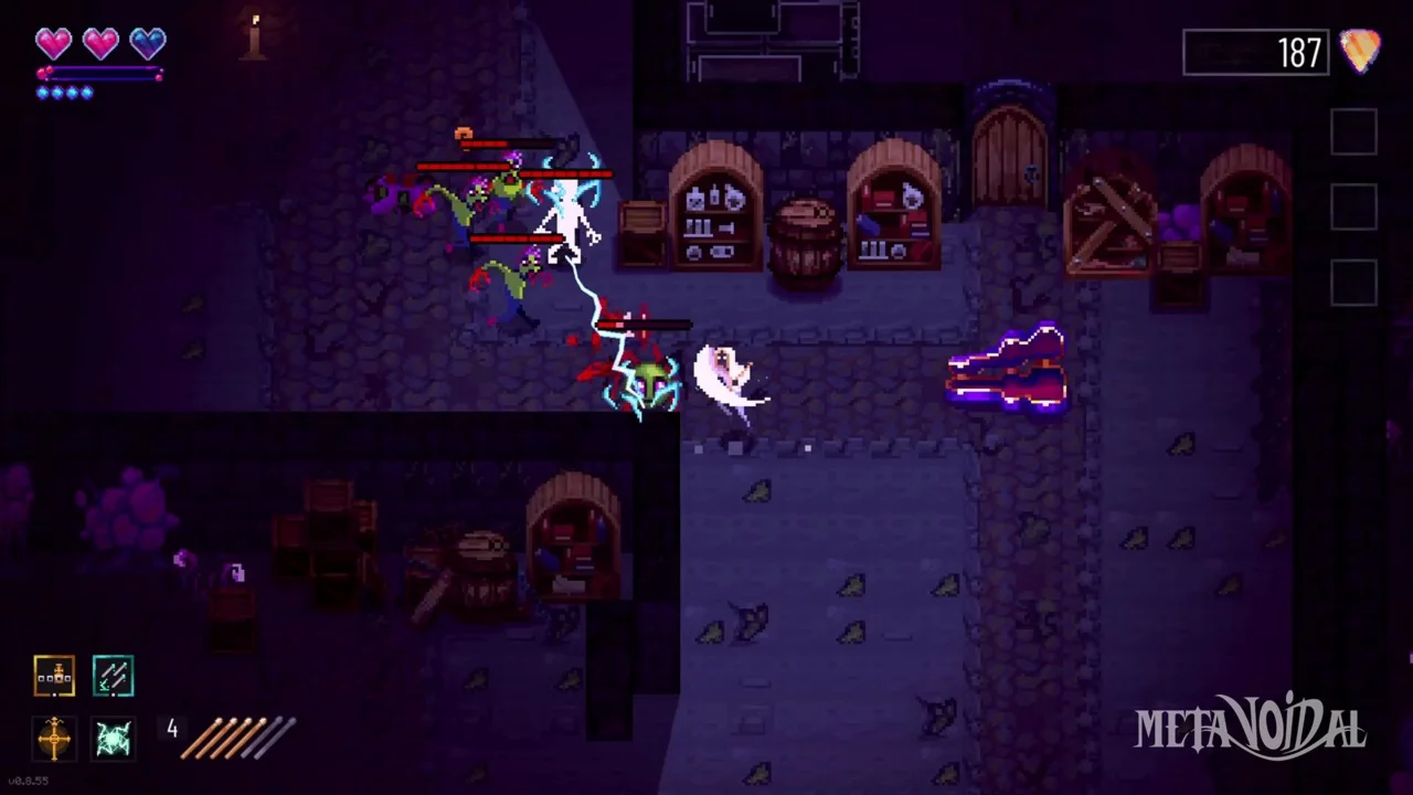 This economy runs on guitar picks and exposure. A seemingly friendly voidling, BingBong, helps you along your quest by advancing your drumming skills… for a price. Their booth at the end of each level is open to trade in guitar picks for something a bit more useful during a run. While in the Sanctuary, they provide perks to add more pep into your double-tapping step.