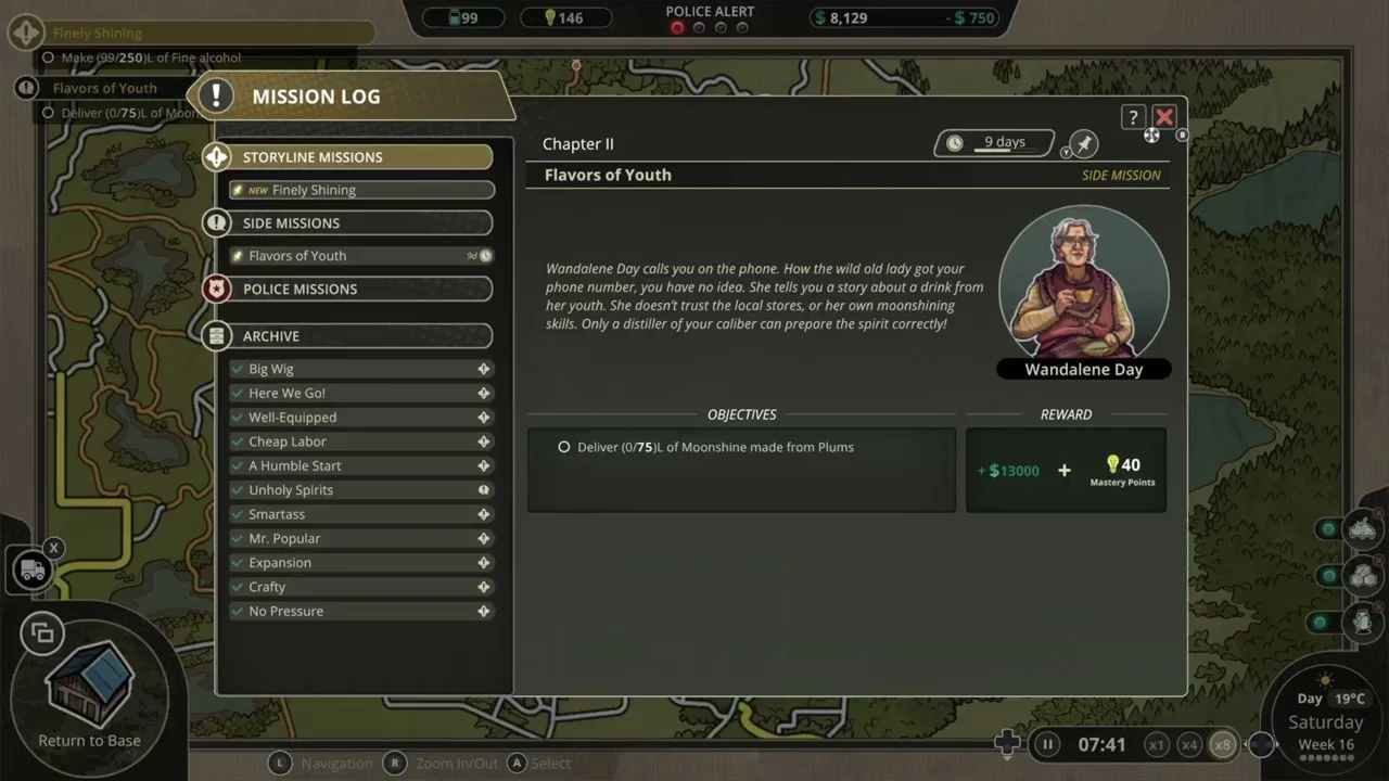 В нашей игре вы возьмете на себя роль молодого самогонщика. Вы будете продвигаться по основным миссиям, выполнять побочные задания и сталкиваться с дорожными событиями во время доставки.