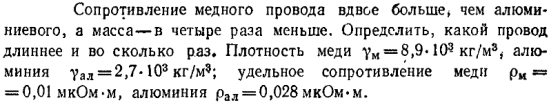 Сопротивление медного провода вдвое больше, чем алюминиевого, а масса - в четыре раза меньше. Определить, какой провод длиннее и во сколько раз. Плотность меди ум = 8,9·103 кг/м3, алюминия yал = 2,7·103 кг/м3; удельное сопротивление меди рм = 0,01 мкОм·м, алюминия рал = 0,028 мкОм·м.