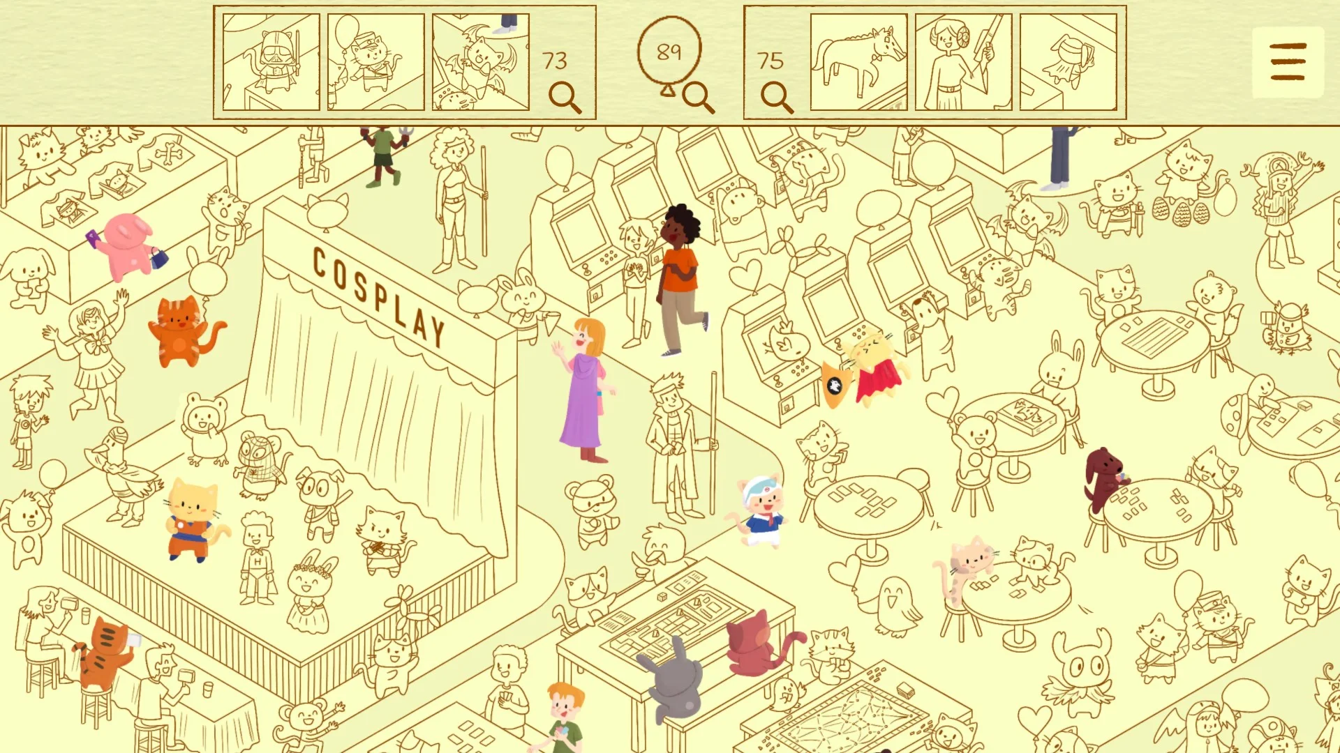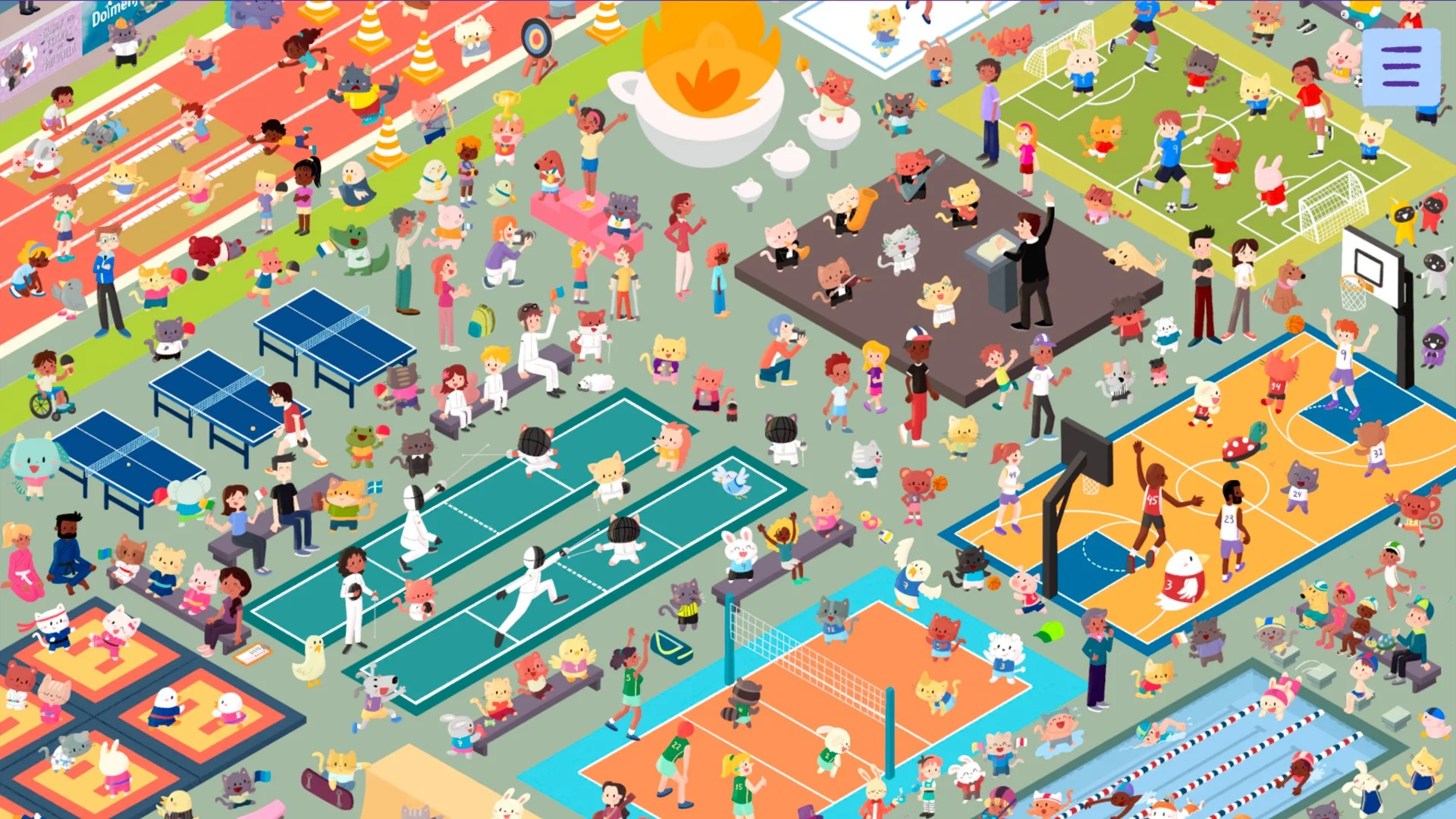 Присоединяйтесь к милым котикам на праздничных сценах! Ищите пушистых друзей и лопайте шарики, исследуя Olympicats — захватывающее мировое спортивное событие, и Comic Cat Con — увлекательный фестиваль поп-культуры.