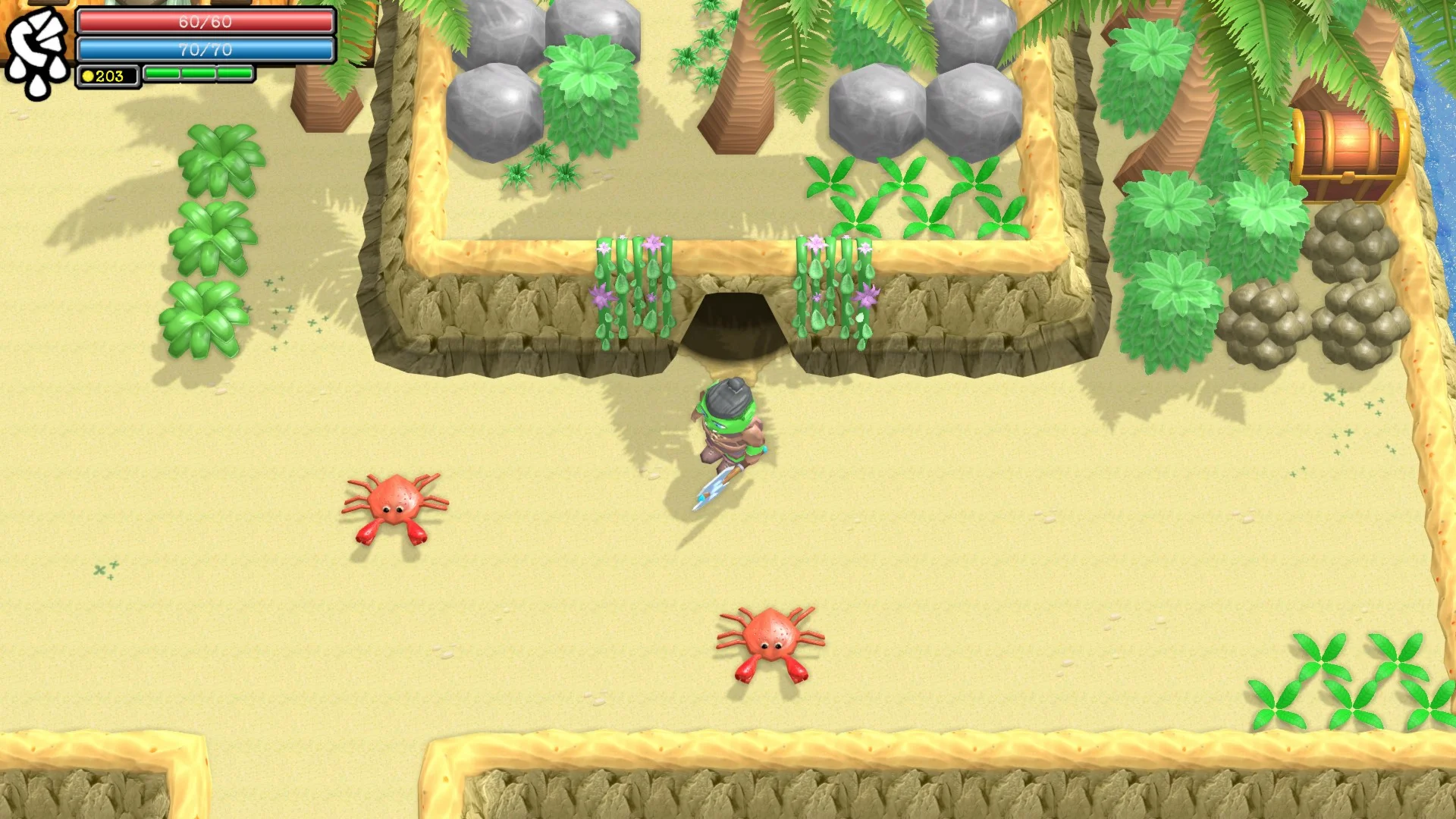 Остров полон опасных подземелий. Чтобы добиться успеха, нашему герою предстоит освоить новые навыки, ловить рыбу, готовить еду, находить сокровища и получать благословения от святынь острова.