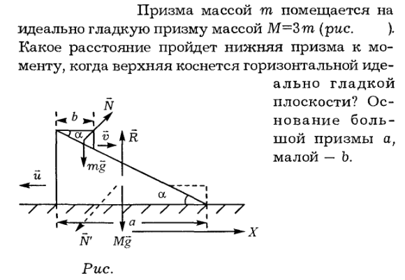 Призма массой m помещается на идеально гладкую призму массой М = 3m (рис.). Какое расстояние пройдет нижняя призма к моменту, когда верхняя коснется горизонтальной идеально гладкой плоскости? Основание большой призмы а, малой — b.