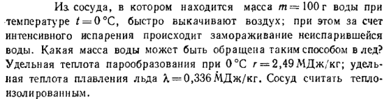 Из, сосуда, в котором находится масса m = 100 г воды при температуре t = 0°С, быстро выкачивают воздух; при этом за счет интенсивного испарения происходит замораживание неиспарившейся воды. Какая масса воды может быть обращена таким способом в лед? Удельная теплота парообразования при 0°С r = 2,49 МДж/кг; удельная теплота плавления льда L = 0,336 МДж/кг. Сосуд считать теплоизолированным.
