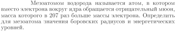 Мезоатомом водорода называется атом, в котором вместо электрона вокруг ядра обращается отрицательный мюон, масса которого в 207 раз больше массы электрона. Определить для мезоатома значения боровских радиусов и энергетических уровней.