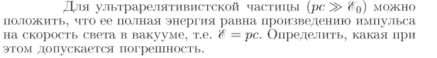 Для ультрарелятивистской частицы (рс >> E0) можно положить, что ее полная энергия равна произведению импульса на скорость света в вакууме, т.е. E=рс. Определить, какая при этом допускается погрешность.