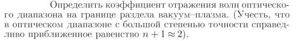 Определить коэффициент отражения волн оптического диапазона на границе раздела вакуум-плазма. (Учесть, что в оптическом диапазоне с большой степенью точности справедливо приближенное равенство n + 1=2).