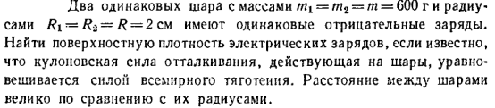 Два одинаковых шара с массами m1 = m2 = m = 600 г и радиусами R1 = R2 = R = 2 см имеют одинаковые отрицательные заряды. Найти поверхностную плотность электрических зарядов, если известно, что кулоновская сила отталкивания, действующая на шары, уравновешивается силой всемирного тяготения. Расстояние между шарами велико по сравнению с их радиусами.