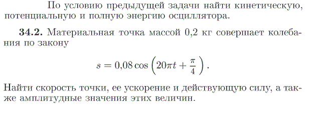 По условию предыдущей задачи найти кинетическую, потенциальную и полную энергию осциллятора. 34.2. Материальная точка массой 0,2 кг совершает колебания по закону s=0,08 cos (20pi·t +pi/4 ) . Найти скорость точки, ее ускорение и действующую силу, а также амплитудные значения этих величин.