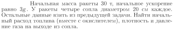 Начальная масса ракеты 30 т, начальное ускорение равно 3g. У ракеты четыре сопла диаметром 20 см каждое. Остальные данные взять из предыдущей задачи. Найти начальный расход топлива (вместе с окислителем), плотность и давление газа на выходе из сопла.