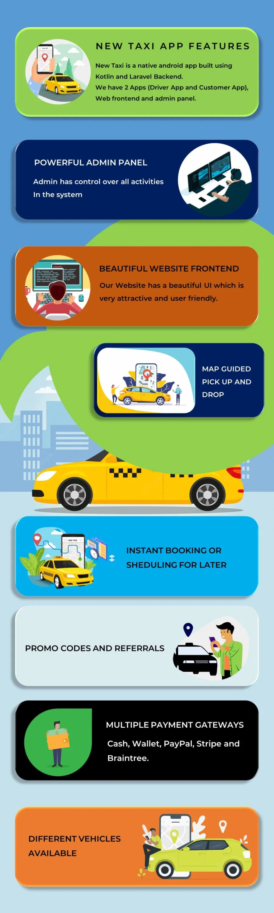 NewTaxi — это полнофункциональное решение для заказа такси по требованию, которое удобно для всех, кто планирует запустить и вести онлайн-бизнес по вызову такси на основе местоположения. Мы разработали NewTaxi так, чтобы его было легко настроить, настроить и запустить. NewTaxi разработан с использованием лучших и передовых технологий. NewTaxi — это нативное приложение, созданное на Kotlin и Laravel для серверной части. Firebase и Sinch используются для связи в реальном времени между приложениями и сервером. Сервер работает на чистом PHP, что обеспечивает оптимальную производительность и скорость. NewTaxi требует минимальных знаний в области разработки программного обеспечения для настройки и управления, а также требует минимум ресурсов.