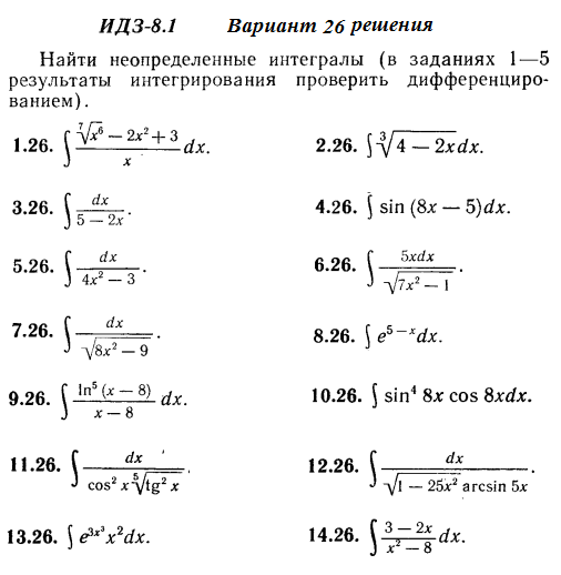 Решения 14-и неопределенных интегралов из Рябушко части 2 ИДЗ 8.1 вариант 26