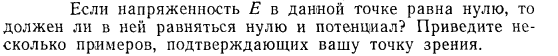 Если напряженность Е в данной точке равна нулю, то должен ли в ней равняться нулю и потенциал? Приведите несколько примеров, подтверждающих вашу точку зрения.