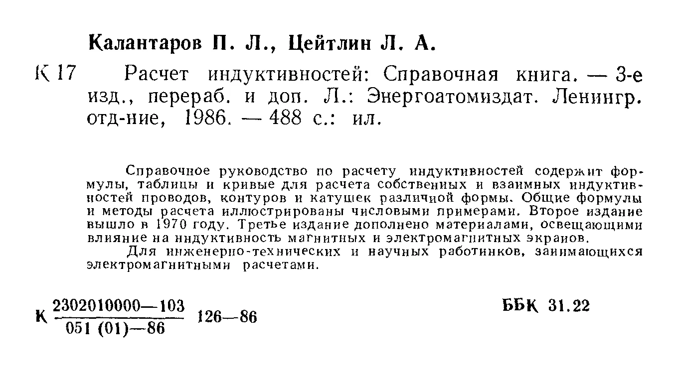 Справочное руководство по расчету индуктивностей содержит формулы, таблицы и кривые для расчета собственных и взаимных индуктивностей проводов, контуров и катушек различной формы. Общие формулы и методы расчета иллюстрированы числовыми примерами.