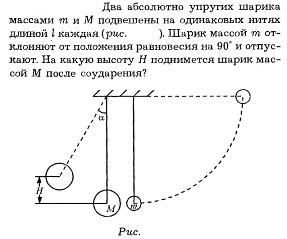 Два абсолютно упругих шарика массами m и М подвешены на одинаковых нитях длиной I каждая (рис.). Шарик массой m отклоняют от положения равновесия на 90° и отпускают. На какую высоту H поднимется шарик массой М после соударения?