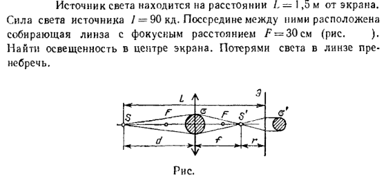 Источник света находится на расстоянии L = 1,5 м от экрана. Сила света источника I = 90 кд. Посередине между ними расположена собирающая линза с фокусным расстоянием F = 30 см (рис. ). Найти освещенность в центре экрана. Потерями света в линзе пренебречь.