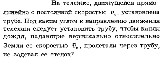 На тележке, движущейся прямолинейно с постоянной скоростью vт, установлена труба. Под каким углом к направлению движения тележки следует установить трубу, чтобы капли дождя, падающие вертикально относительно Земли со скоростью vк пролетали через трубу, не задевая ее стенок?