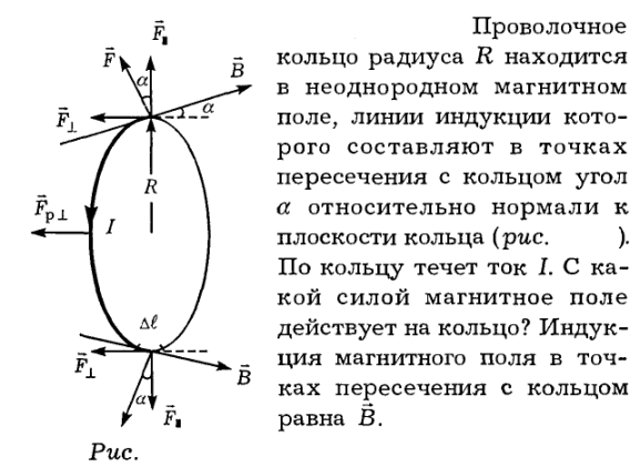 Проволочное кольцо радиуса R находится в неоднородном магнитном поле, линии индукции которого составляют в точках пересечения с кольцом угол а относительно нормали к плоскости кольца (рис.). По кольцу течет ток I. С какой силой магнитное поле действует на кольцо? Индукция магнитного поля в точках пересечения с кольцом равна В.