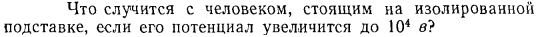 Что случится с человеком, стоящим на изолированной подставке, если его потенциал увеличится до 10^4 В?