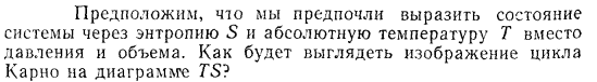 Предположим, что мы предпочли выразить состояние системы через энтропию S и абсолютную температуру Т вместо давления и объема. Как будет выглядеть изображение цикла Карно на диаграмме TS?
