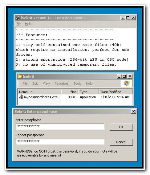 Представляет собой "блокнот", в котором записи шифруются криптостойким 256-разрядным ключом AES, а затем преобразуются в exe-файлы.