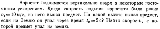Аэростат поднимается вертикально вверх с некоторым постоянным ускорением. Когда скорость подъема аэростата была равна v1 = 10 м/с, из него выпал предмет. На какой высоте выпал предмет, если на Землю он упал через время t0 = 5 с? Найти скорость, с которой предмет упал на землю.