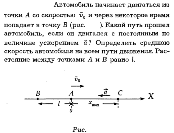 Автомобиль начинает двигаться из точки A со скоростью v0 и через некоторое время попадает в точку В (рис.). Какой путь прошел автомобиль, если он двигался с постоянным по величине ускорением а? Определить среднюю скорость автомобиля на всем пути движения. Расстояние между точками A и В равно I.