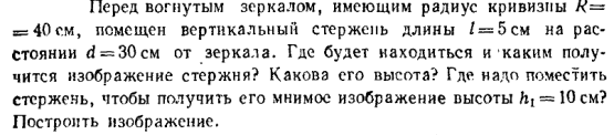 Перед вогнутым зеркалом, имеющим радиус кривизны R = 40 см, помещен вертикальный стержень длины l = 5 см на расстоянии d = 30 cм от зеркала. Где будет находиться и каким получится изображение стержня? Какова его высота? Где надо поместить стержень, чтобы получить его мнимое изображение высоты h1 = 10 cм? Построить изображение.