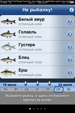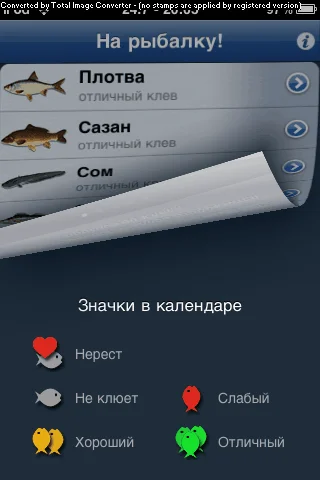 На рыбалку! / Fishing Days Будь вы профессиональный рыбак или просто любитель, это приложение станет вашим помощником при выборе дней для похода на рыбалку. Оно укажет те дни, когда рыба питается наиболее активно и лучше клюет.