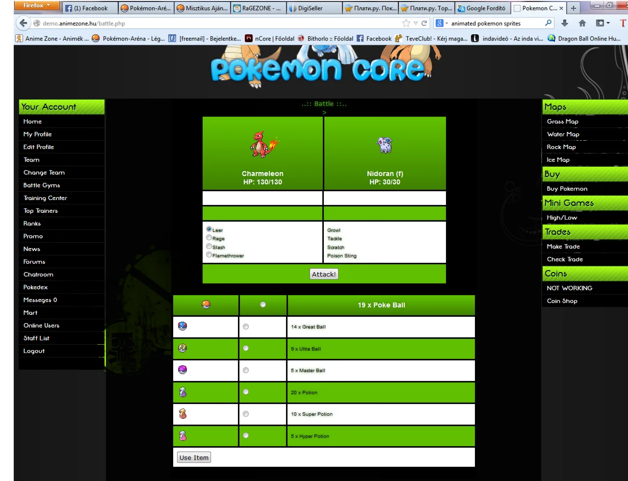Основные Покемон браузерная игра. Сбор и научить покемонов. Сражайтесь с другими игроками. Победить лидер гимнастики и собирать значки. Торговля покемонов с другими игроками.