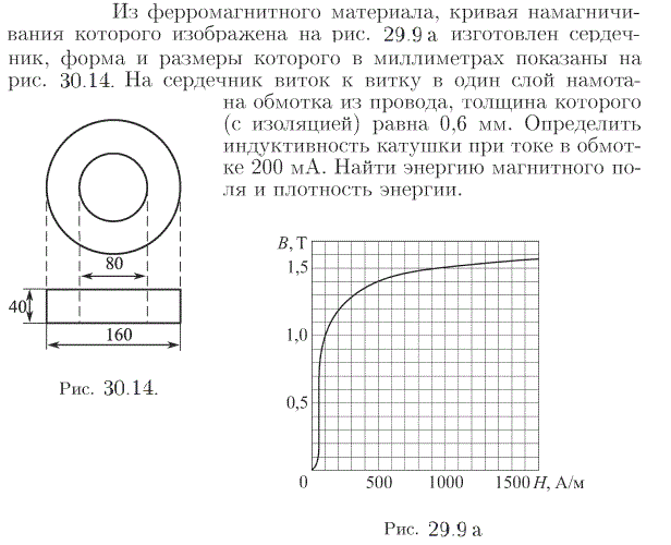Из ферромагнитного материала, кривая намагничивания которого изображена на рис. 29.9 а, изготовлен сердечник, форма и размеры которого в миллиметрах показаны на рис. 30.14. На сердечник виток к витку в один слой намота на обмотка из провода, толщина которого (с изоляцией) равна 0,6 мм. Определить индуктивность катушки при токе в обмотке 200 мА. Найти энергию магнитного поля и плотность энергии.