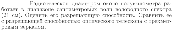 Радиотелескоп диаметром около полукилометра работает в диапазоне сантиметровых волн водородного спектра (21 см). Оценить его разрешающую способность. Сравнить ее с разрешающей способностью оптического телескопа с трехметровым зеркалом.