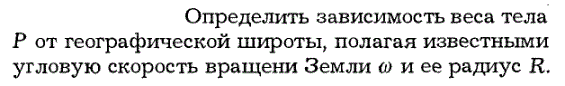 Определить зависимость веса тела Р от географической широты, полагая известными угловую скорость вращения Земли w и ее радиус R.