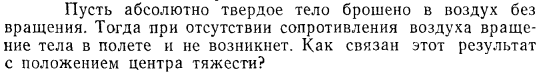 Пусть абсолютно твердое тело брошено в воздух без вращения. Тогда при отсутствии сопротивления воздуха вращение тела в полете и не возникнет. Как связан этот результат с положением центра тяжести?