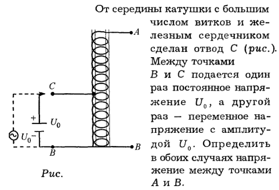 От середины катушки с большим числом витков и железным сердечником сделан отвод С (рис.). Между точками B и С подается один раз постоянное напряжение U0, а другой раз — переменное напряжение с амплитудой U0. Определить в обоих случаях напряжение между точками A и B.
