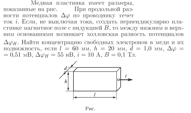 Медная пластинка имеет размеры, показанные на рис. 31.3. При продольной разности потенциалов dfi по проводнику течет ток i. Если, не выключая тока, создать перпендикулярно пластинке магнитное поле с индукцией В, то между нижним и верхним основаниями возникает холловская разность потенциалов dfi_h- Найти концентрацию свободных электронов в меди и их подвижность, если l=60 мм, b=20 мм, d=1,0 мм, dfi==0,51 мВ, dfi_H=55 нВ, i=10 А, В=0,1 Тл.