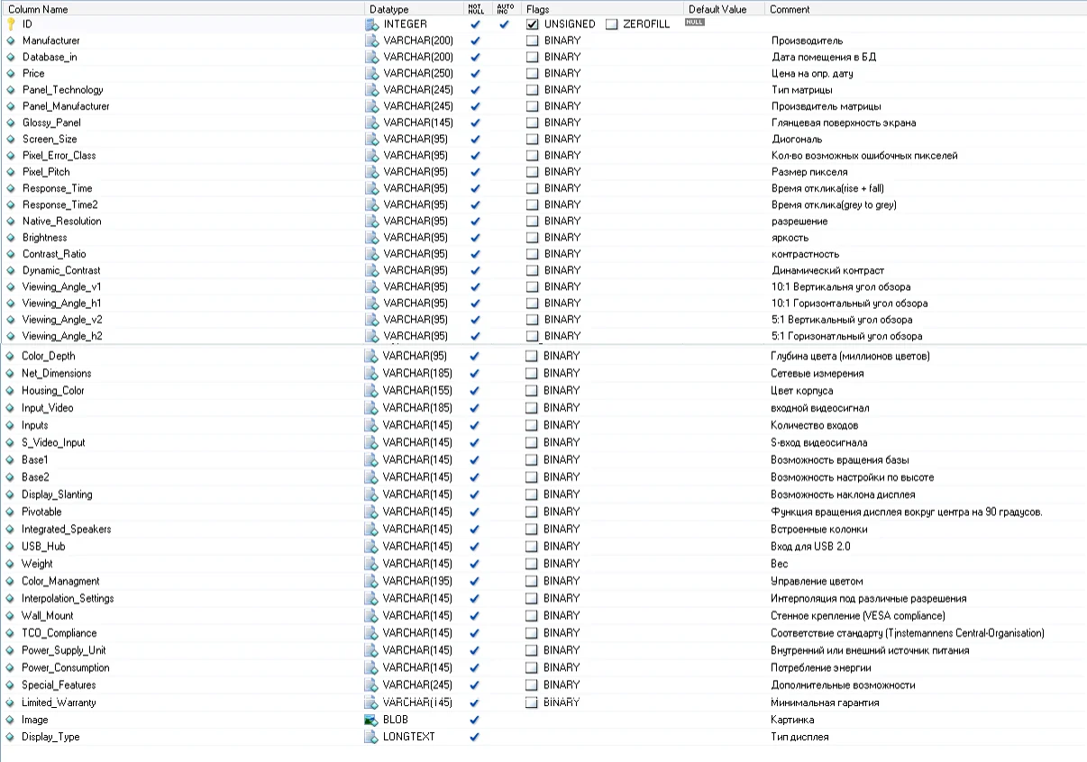 Магазин » MySQL база данных технических характеристик LCD экранов