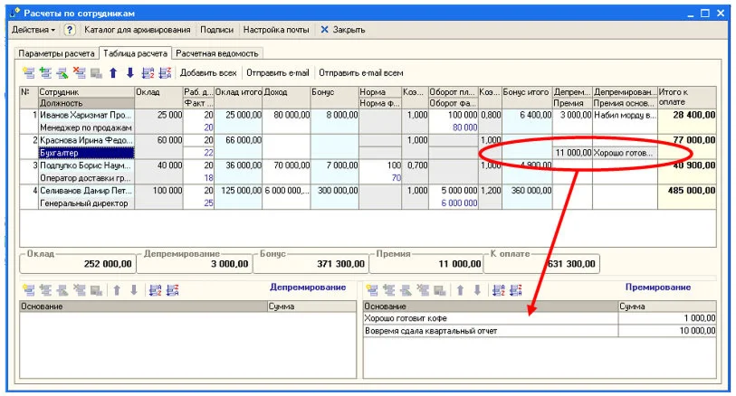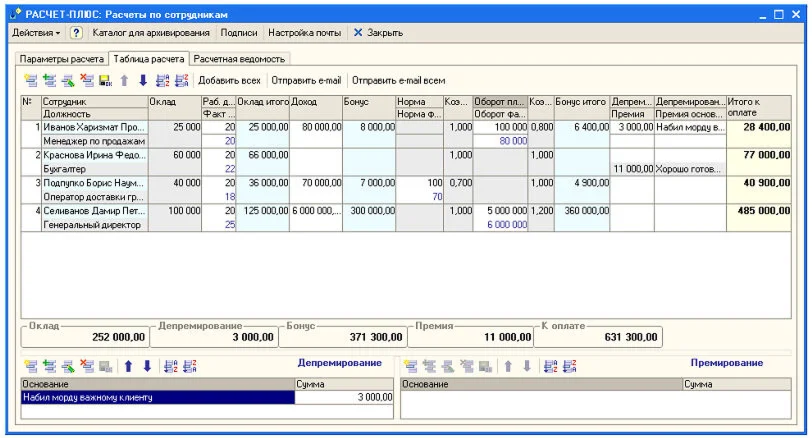 При многострочном режиме премирования или депремирования, сумма по всем строкам нижних таблиц отображается в соответствующих колонках выбранной строки в таблице расчета.