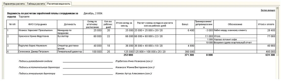Расчетная ведомость (рис. 4) печатается автоматически, при переходе на ее закладку. Никаких дополнительных действий совершать не требуется.