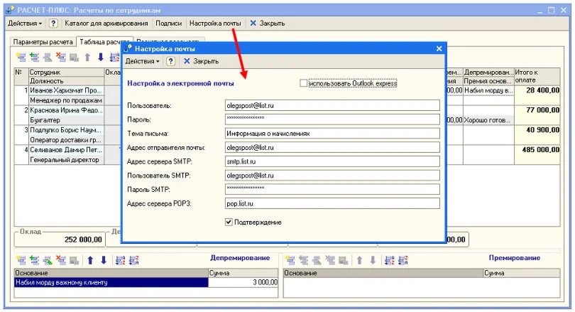 Имеется два режима отправки электронной почты: по выбранной строке, или по всему списку сотрудников. Для работы с электронной почтой необходимо предварительно произвести ее настройку (рис. 5) через верхнюю командную панель на форме.