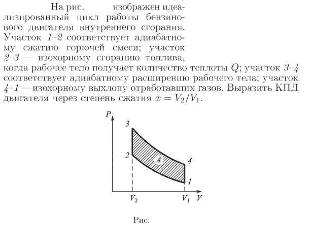 На рис. 18.17 изображен идеализированный цикл работы бензинового двигателя внутреннего сгорания. Участок 1-2 соответствует адиабатному сжатию горючей смеси; участок 2-3 — изохорному сгоранию топлива, когда рабочее тело получает количество теплоты Q: участок 3-4 соответствует адиабатному расширению рабочего тела; участок 4-1 — изохорному выхлопу отработавших газов. Выразить КПД двигателя через степень сжатия х=V2/V1.
