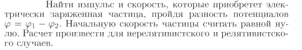 Найти импульс и скорость, которые приобретет электрически заряженная частица, пройдя разность потенциалов fi=fi1 — fi2- Начальную скорость частицы считать равной нулю. Расчет произвести для нерелятивистского и релятивистского случаев.