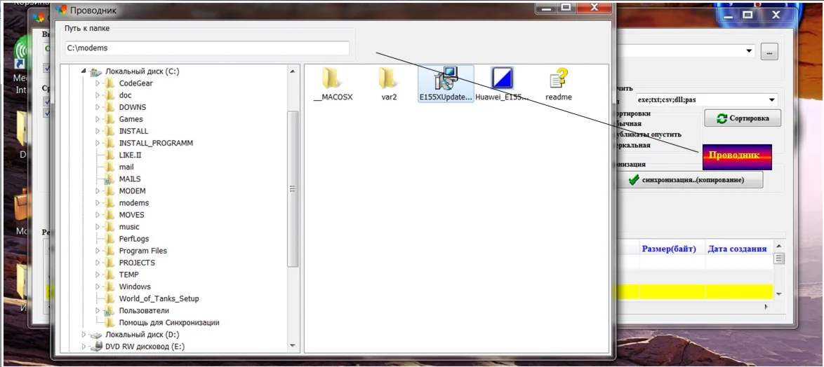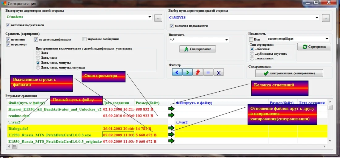Эта программа предназначена для синхронизации двух выбранных каталогов, т.е. пользователь определяет два каталога для сравнения, программа находит и отображает файлы из этих двух каталогов, после чего пользователь назначает файлы для синхронизации(копирования файлов из одного каталога в другой), с возможностью назначения пути копирования после чего возможно синхронизировать эти каталоги, причём наименование и другие атрибуты файла сохраняются в скопированном файле оригинала.