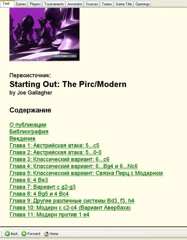 За основу взята е-книга Starting Out - Joe Gallagher - Pirc & Modern. Материал переведен и дополнен новыми вариантами и оценками позиций. Сделано качественно, наглядно. Отличия Пирца от Модерн, особенности применения каждой дебютной линии.