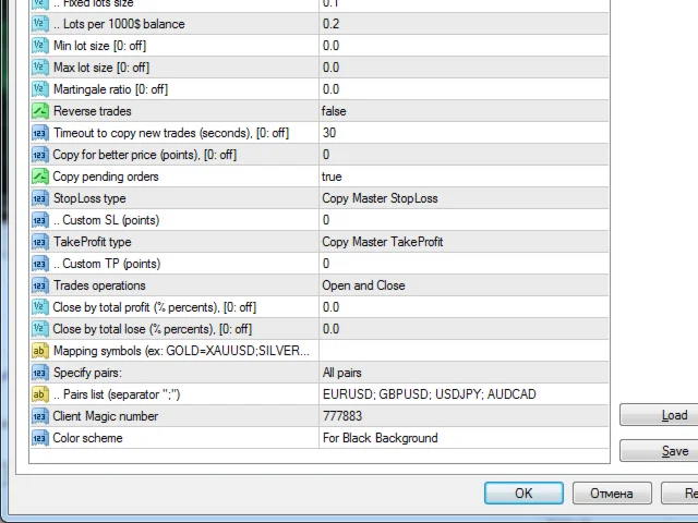 5) Прямое и реверсное копирование ордеров (Например BUY->SELL и наоборот, что позволяет выводить стабильно убыточные счета или советники в прибыль)