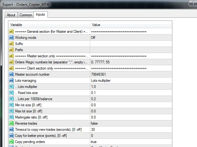 В настройках каждого советника выбрать режим работы: если Master – то поле Master account number # не заполнять, а в случае Slave установить номер Master-счета, с которого будут копироваться сделки