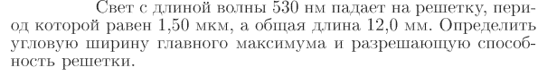 Свет с длиной волны 530 нм падает на решетку, период которой равен 1,50 мкм, а общая длина 12,0 мм. Определить угловую ширину главного максимума и разрешающую способность решетки.