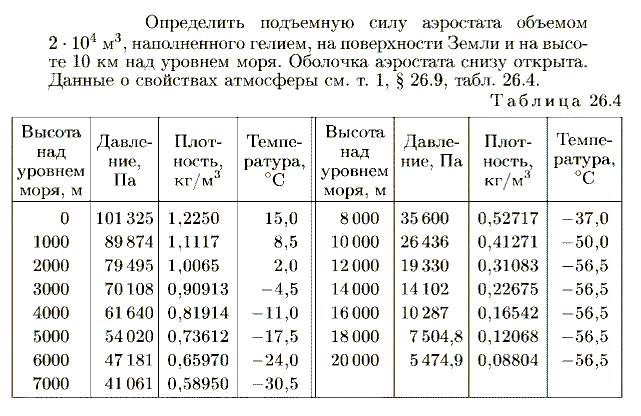 Определить подъемную силу аэростата объемом 2·104 м3, наполненного гелием, на поверхности Земли и на высоте 10 км над уровнем моря. Оболочка аэростата снизу открыта. Данные о свойствах атмосферы см. т. 1, § 26.9, табл. 26.4.